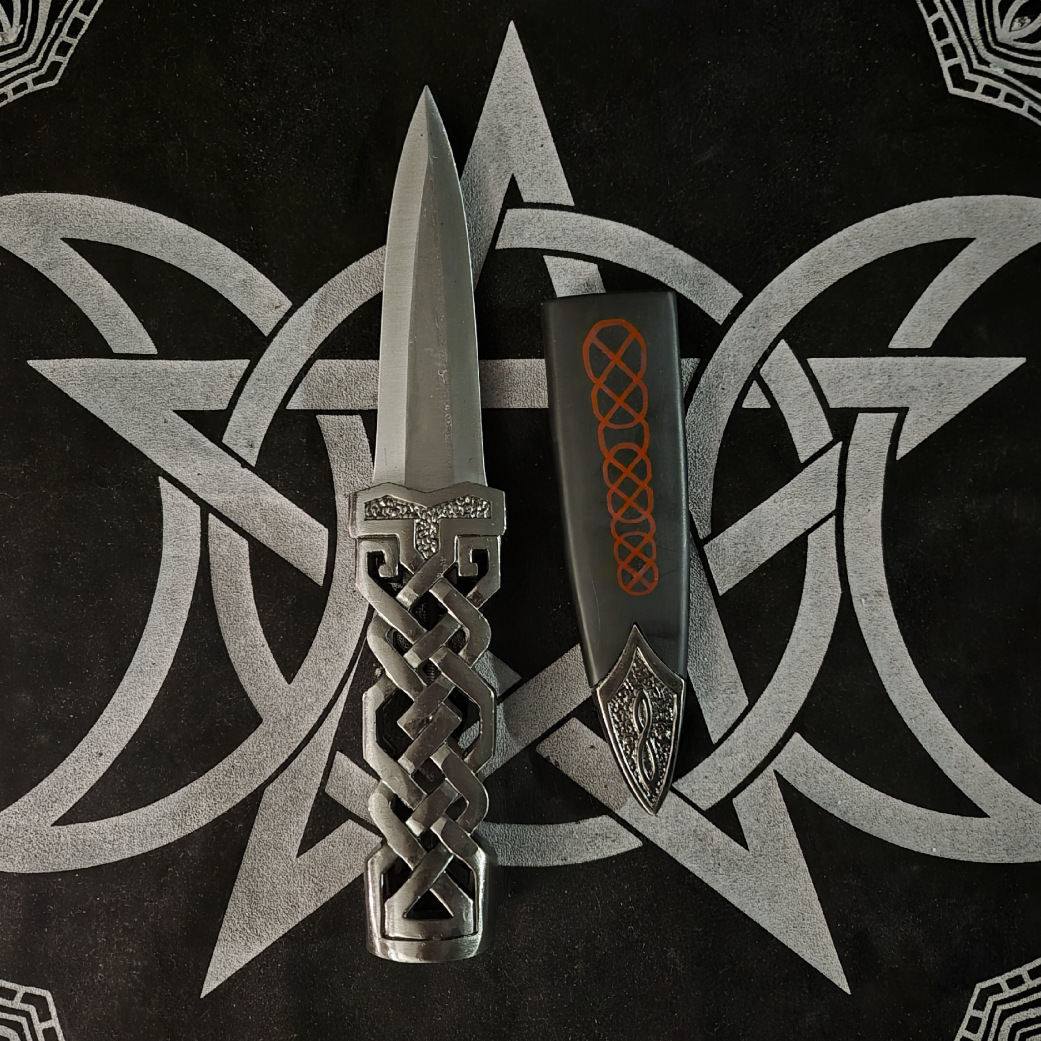 Il coprilama, anch’esso in acciaio e plastica, è ornato con motivi celtici coordinati, completando il design armonioso di questo straordinario strumento. Perfetto per tracciare cerchi, canalizzare energia e arricchire il tuo altare con un oggetto di grande eleganza e potere.